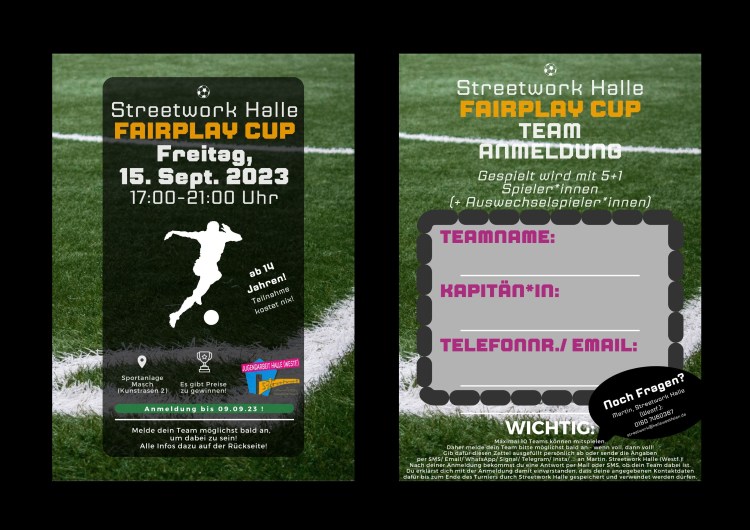 Von Jugendlichen für Jugendliche wird am 15.09.23 ein Freizeit-Fußballturnier organisiert! Sei dabei, finde eine Handvoll Mitspieler*innen und melde schnell dein Team an! Alle wichtigen Infos dazu hier auf dem Flyer: