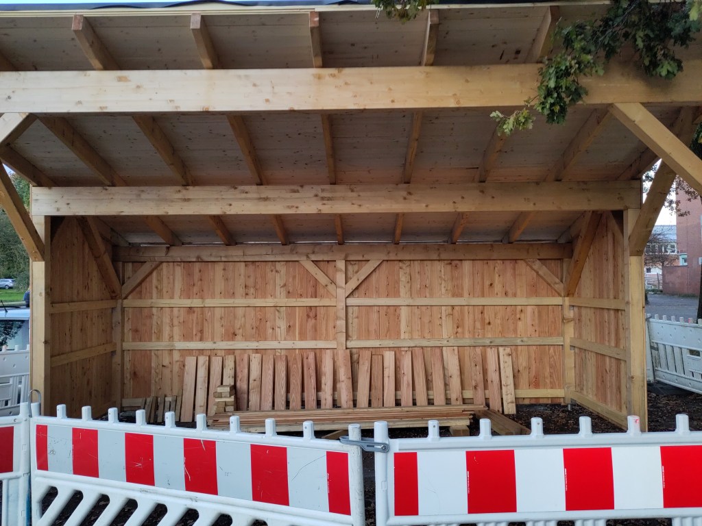 Jetzt verabschiede ich mich für eine Woche in den Urlaub, danach geht’s weiter mit der Einrichtung (Sitzgelegenheiten, Mülleimer usw.) und dann wird auch die zweite Hütte, Nähe Bahnhof, in Angriff genommen.